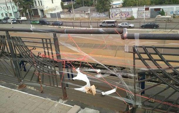 Столичні комунальники “відремонтували” металеву огорожу на мосту біля Привокзальної площі, закривши її скотчем і нитками.Йдеться…