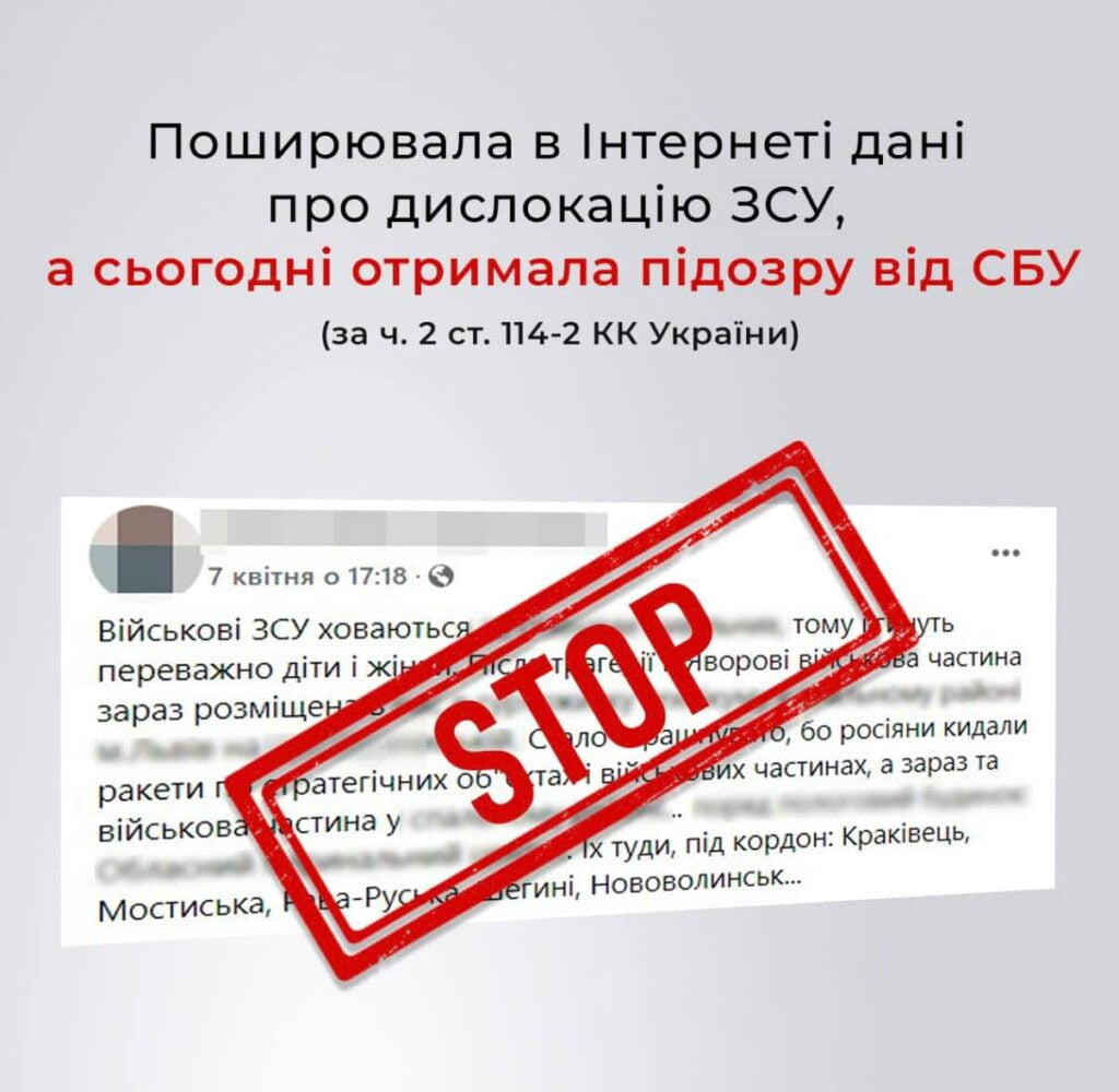 Спецслужба оголосила про підозру у вчиненні злочину жінці, яка поширювала інформацію про розташування Збройних Сил України. На особистій сторінці у соцмережі «Facebook» вона публікувала точні дані про розташування українських військових у Львові.
