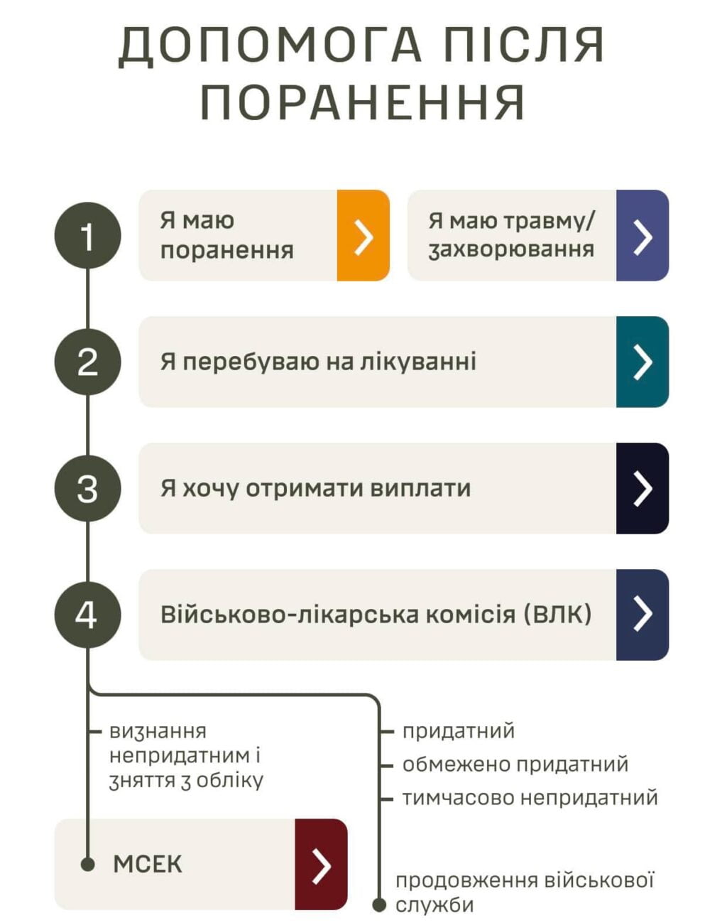 Відповіді на усі запитання та покрокову інструкцію ви можете знайти у довіднику «Шлях пораненого» на сайті Міністерство оборони України