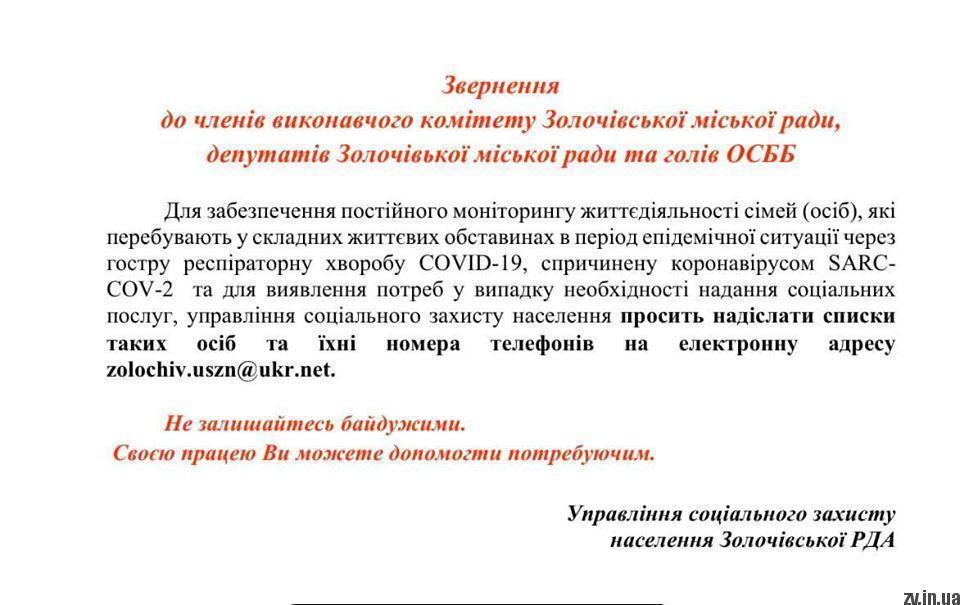 Управління соціального захисту населення Золочівської РДА звернулось через соціальні мережі до депутатів Золочівської міської ради. членів виконавчого комітету, голів ОСББ повідомити про осіб. котрі опинились у складних життєвих обставинах у час запровадження заходів із запобігання поширенню інфекції коронавірусу.